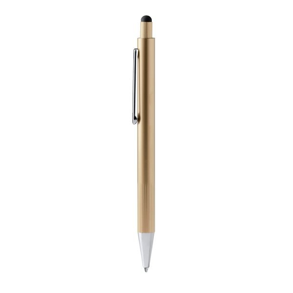 Aluminium ballpoint pen with striped grip in metallic finish and touch pointer.